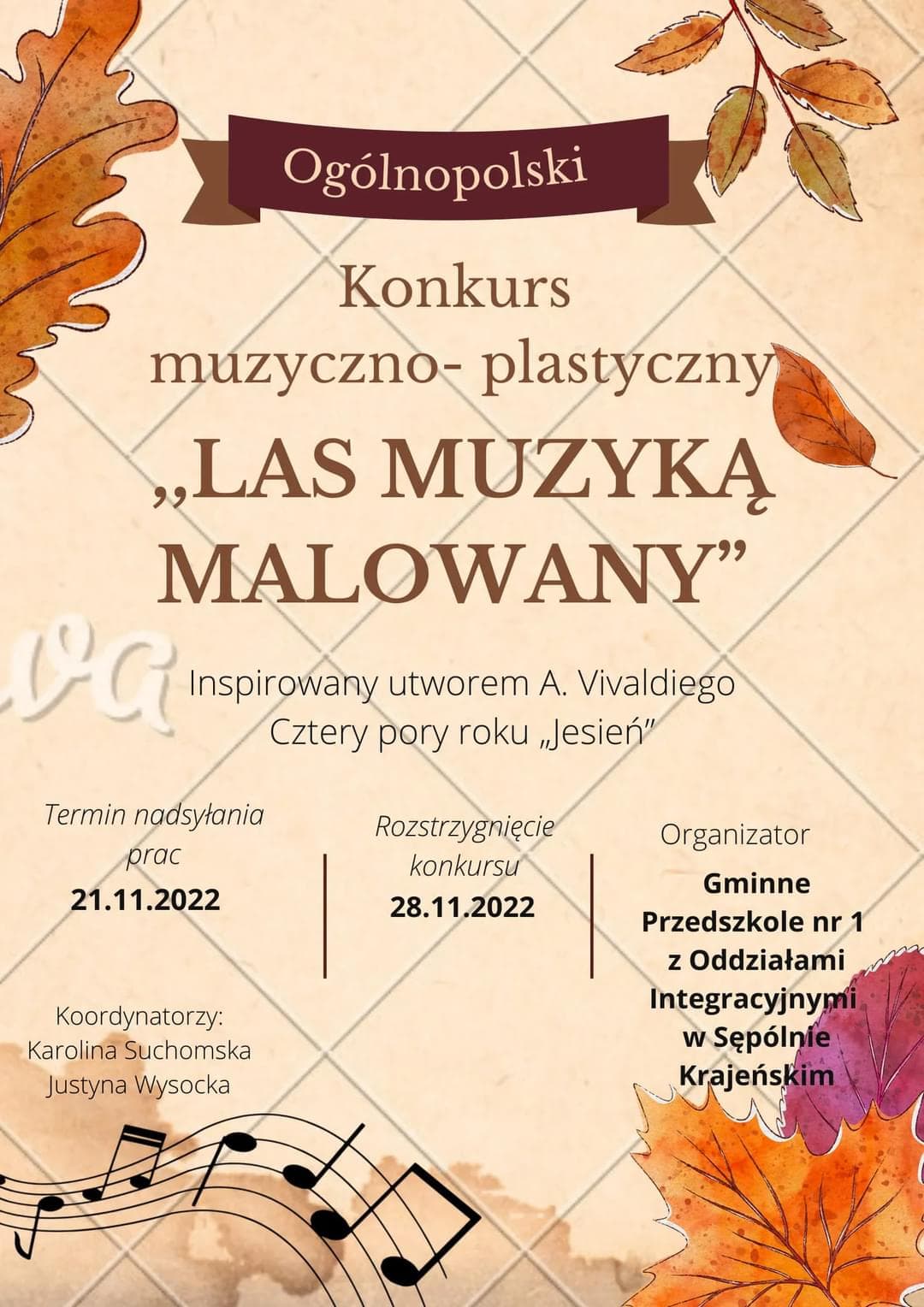w Ogólnopolskim Konkursie Muzyczno – Plastycznym pt. ,,LAS – MUZYKĄ MALOWANY”.