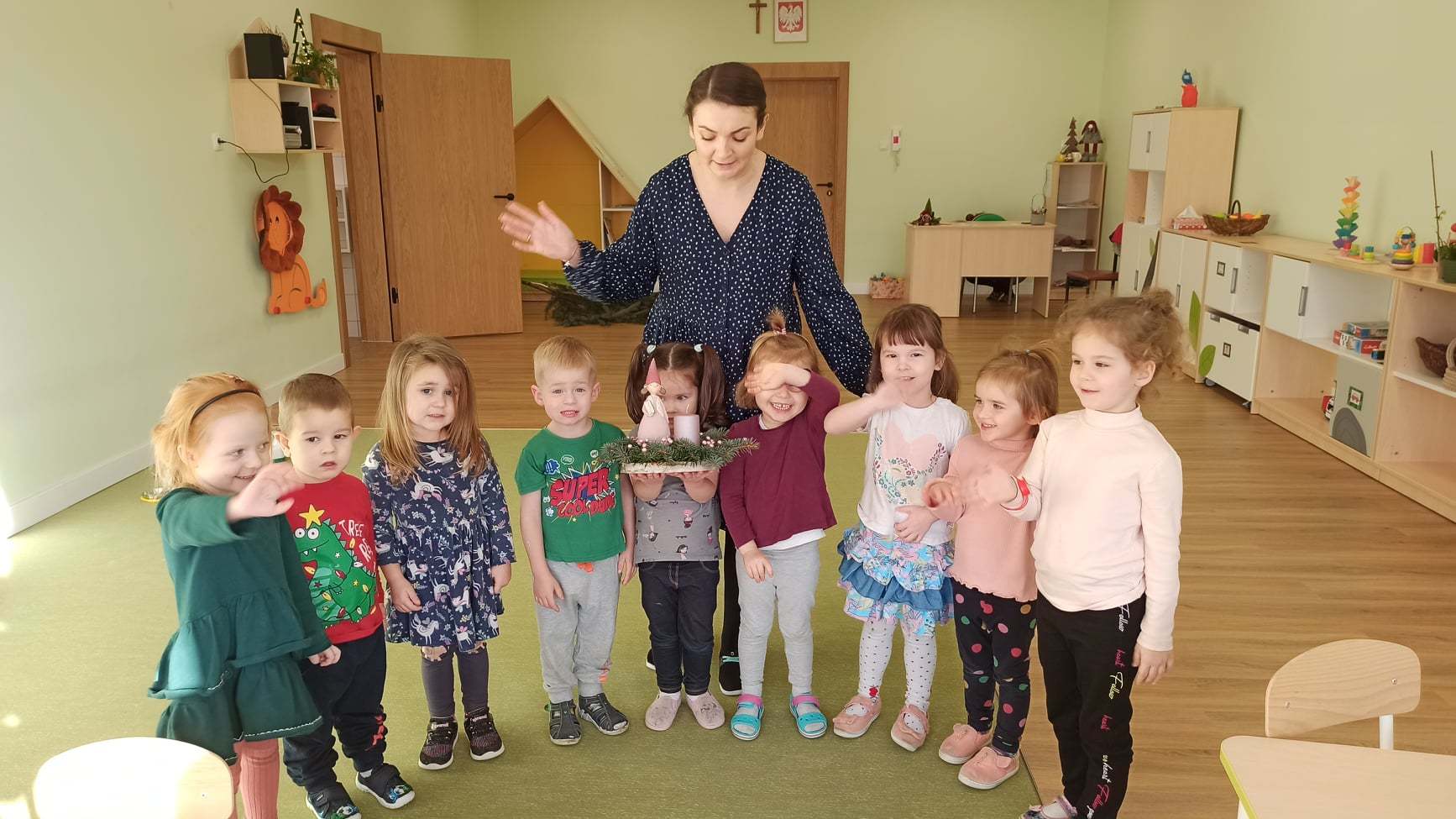 Każda grupa włożyła ogrom swojego serduszka w wykonanie upominków lub kartek świątecznych dla naszych kolegów. Tygryski wykonały stroik świąteczny dla Lenki. Został on przekazany na licytację, z której dochód został przeznaczony na rehabilitację naszej koleżanki. Kartka zaś powstała z małych rączek przedszkolaków.
