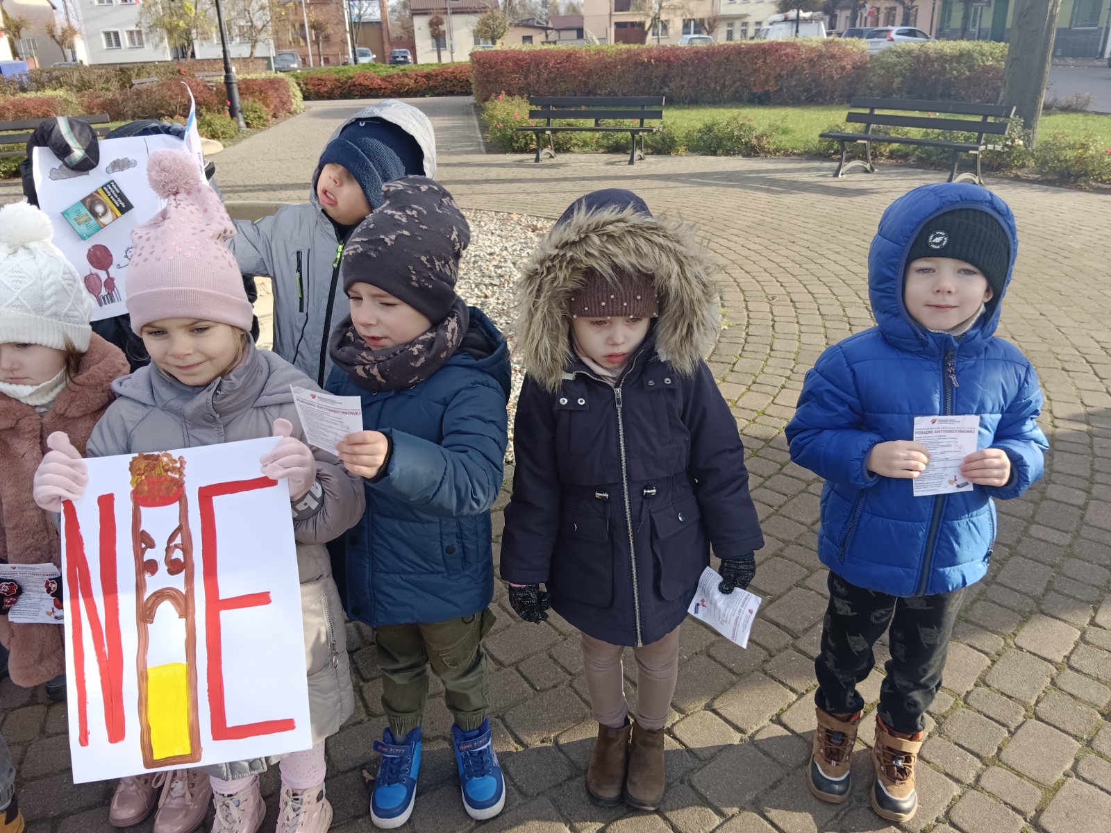 Dzieci z grupy Rybki i Tygryski wzięły udział w akcji ,,Rzuć palenie razem z nami”. Zorganizowaliśmy przemarsz ulicami naszego miasteczka. Skandowaliśmy hasła zniechęcające do palenia tytoniu. Dzieci wraz z rodzicami oraz wychowawcami przygotowały plakaty i prace plastyczne informujące o zgubnym wpływie palenia tytoniu na zdrowie ludzi. Przedszkolaki rozdawały przechodniom ulotki z informacjami o sposobach skutecznego rzucania palenia. Organizując akcję i podejmując z przedszkolakami szereg innych działań m.in.: wyszukiwanie w czasie spacerów rodzajów i źródeł wydobywających się dymów, prace plastyczne na ww. temat, nauka piosenki o Dinku, który ,,nie lubi palaczy, ucieka od dymu”, zrealizowaliśmy program z Sanepidu ,,Czyste powietrze wokół nas”.