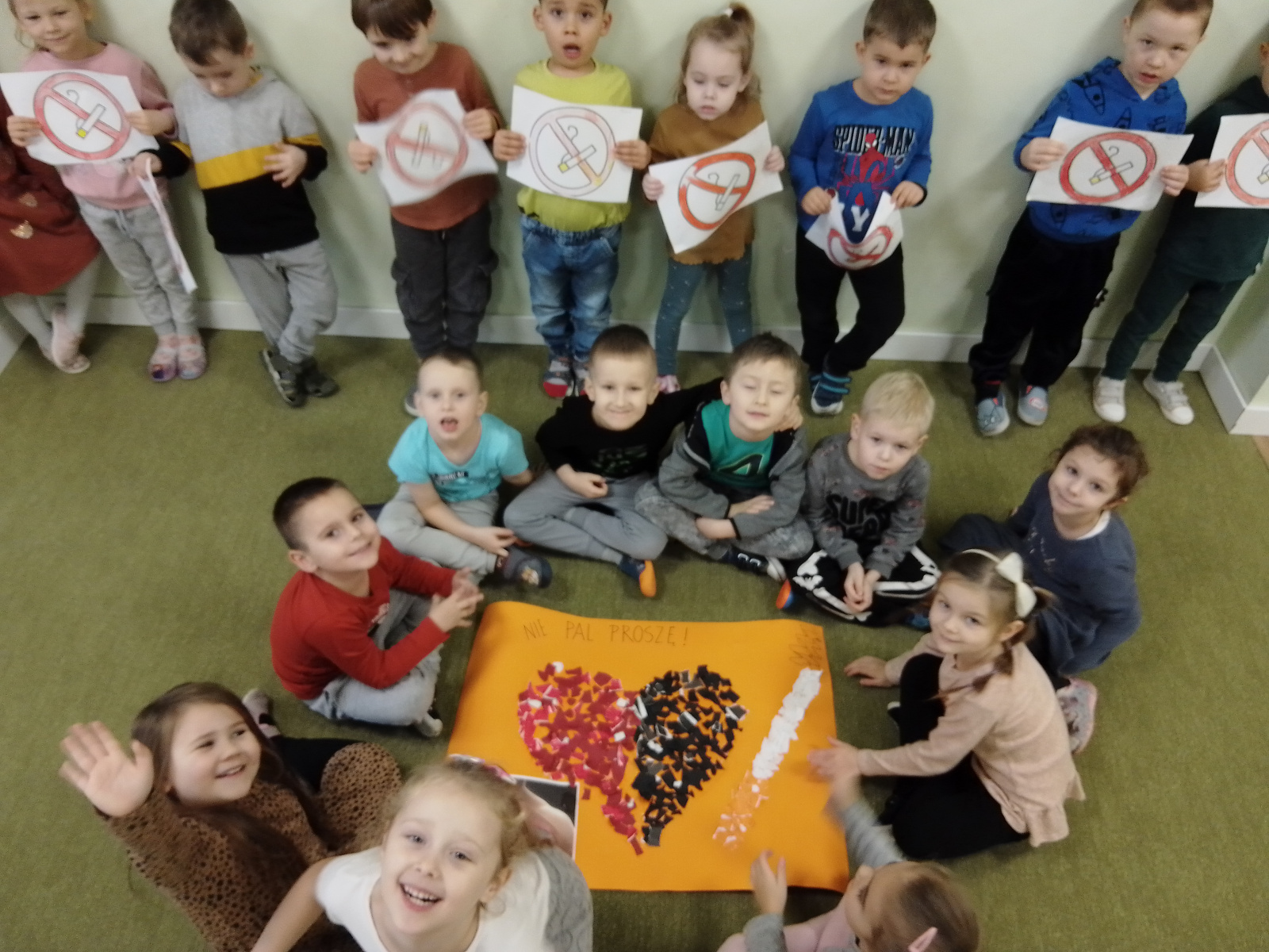 Dzieci uczestniczyły we wspólnych pogadankach na temat szkodliwości palenia papierosów oraz ich wpływu na nasze zdrowie. Przedszkolaki przygotowały plakat antynikotynowy i zaprezentowały go na wspólnej wystawie – dzieci wykazały się dużą kreatywnością w tworzeniu pracy.