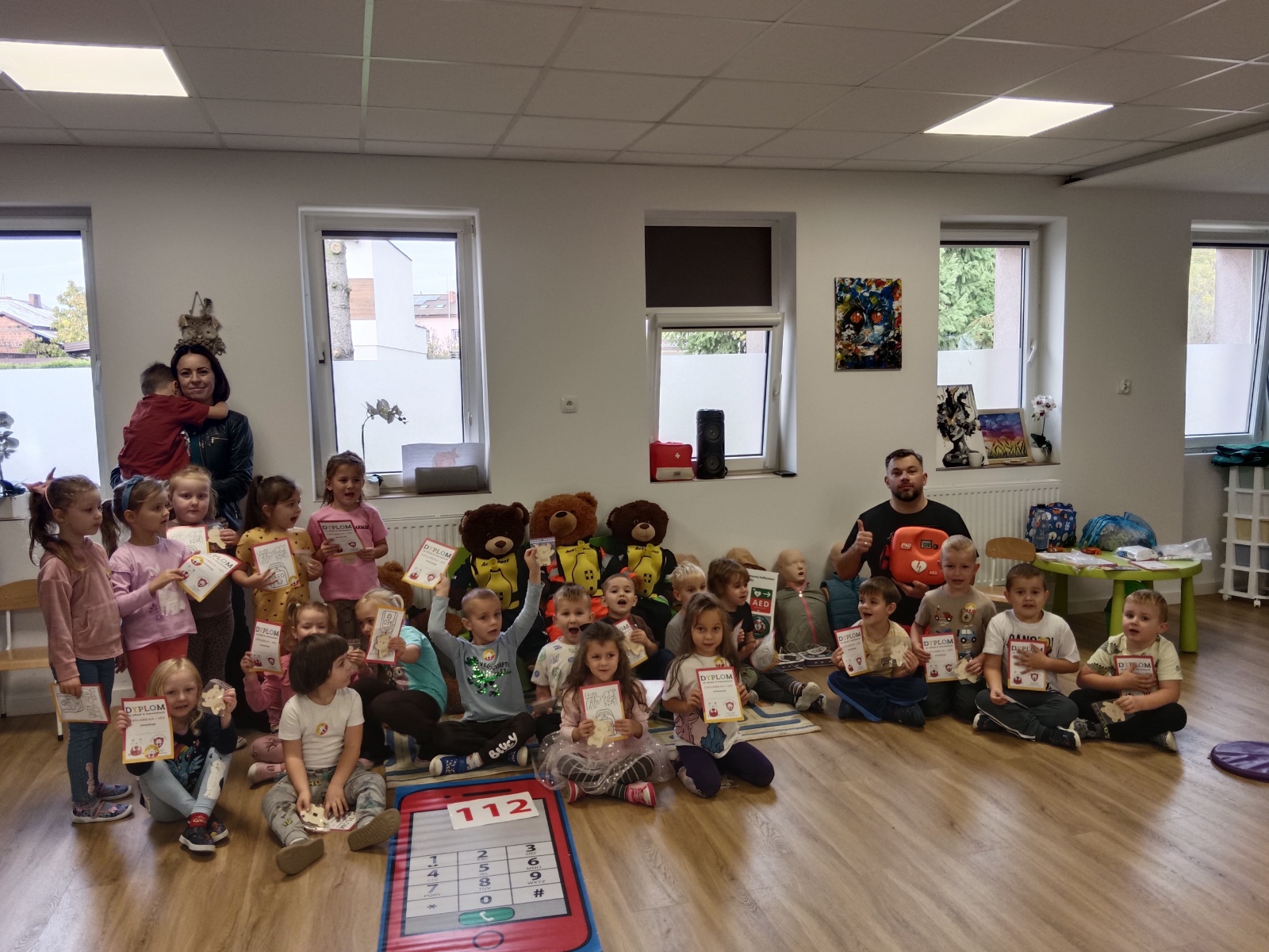 W październiku gościliśmy w naszym przedszkolu dwie mamy - panią Ewelinę Walczak oraz panią Ewelinę Jąkalską, które przygotowały dla dzieci niezwykłe zajęcia. Była bajka przeczytana w języku francuskim oraz teatrzyk ,,Czerwony Kapturek". Z okazji Dnia Edukacji Narodowej przedszkolaki przygotowały część artystyczną dla wszystkich pracowników placówki. Tym samym wyraziły wdzięczność za codzienną pracę i poświęcenie. Cieszyliśmy się kolorową jesienią wychodząc na spacery i tworząc ciekawe prace plastyczne. W październiku odbyły się również ważne zajęcia dotyczące ratowania życia w nagłych przypadkach - zajęcia z Misiem Ratownikiem. Miesiąc zakończyliśmy logopedycznymi zabawami na Dzień Dyni.
