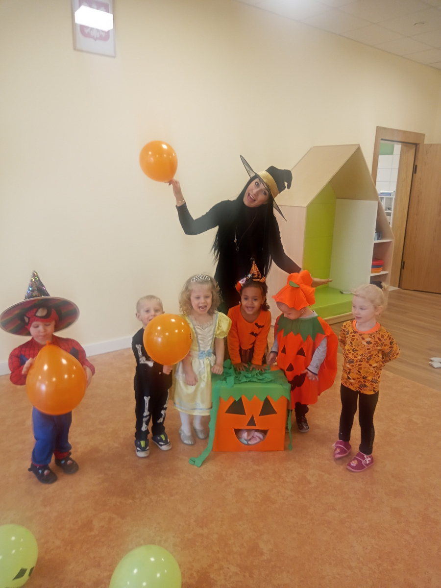 W październiku Pszczółki obchodziły Światowy Dzień Uśmiechu. Uśmiech nas nic nie kosztuje, a potrafi przegonić ciemne chmury, dlatego tego dnia, tak pięknie świeciło słoneczko, bo Przedszkolaki zarażały uśmiechem. Szczęście i radość towarzyszyły nam przy wspólnej zabawie kolorowymi i zabawnymi emotikonami. Nie mogło zabraknąć zabawy z chusteczką i jabłuszkiem , gdzie Dzieci wręczając je sobie radośnie się uściskały i przekazały magiczny uśmiech. Następnie przystąpiły do malowania uśmiechu na kartce papieru. 11 października obchodziliśmy Dzień Drzewa Na Dzieci czekało mnóstwo atrakcji : -ten dzień zaczął się od rytmiki z Panią Dyrektor - wspólnych zabaw nie było końca -następnie Przedszkolaki udały się na plac zabaw i zaczęły zabawę w podchody Wszystkie Pszczółki dzielnie szukały 4 kopert z zagadkami i elementami puzzli. Po rozwiązaniu zagadek, nastąpiło ... - wspólne zasadzenie drzewa Pszczółki mają swoje własne drzewo jakim jest świerk. Przedszkolaki wiedzą, że trzeba dbać o drzewko i je podlewać . -sesja zdjęciowa w fotobudce. - czerpanie dobrej energii z drzew/ wspólny taniec wokół drzewa Pszczółki przytulały się do drzewa, aby pobrać z niego mnóstwo energii na dalsze atrakcje tego dnia. - ścieżka sensoryczna Pszczółeczki pokonały ścieżkę sensoryczną w kształcie drzewa. Przedszkolakom nie straszne były szyszki, kora z drzew, patyki, igliwie czy też kasztany. Największą zabawą była jednak zabawa w deszcz z liści - wtedy uśmiech na twarzyczkach nie znikał -malowanie drzewa stopami . Tutaj Chłopcy i Dziewczynki mieli sporo zabawy, gdzie maczali stopy w farbie i tworzyli piękne drzewo. - Na sam koniec atrakcji do Przedszkolaków przybyły "Drzewa" , które wręczyły Dzieciom Certyfikat, a same Pszczółki obiecały dbać o swoje drzewo. W nagrodę za posadzenie drzewa Pszczółeczki dostały cukierki. Dzień Dyni Pszczółeczki tego dnia pracowały intensywnie Robiliśmy wspólnie ciasto dyniowe, gdzie każda Pszczółka dodawała poszczególne składniki. Dzieci pod nadzorem Cioci bardzo chętnie wszystko blendowały - były bardzo zaangażowane przy tym zadaniu. Następnie wszyscy udaliśmy się do kuchni i Ciocia Kamilka włożyła nasze ciasto do piekarnika. Nie mogło zabraknąć tam również Pani Dyrektor, która dbała o nasze bezpieczeństwo. Kiedy czekaliśmy aż ciasto się upiecze to wszyscy zrobiliśmy sobie bal przebierańców. Były tańce, zabawy, konkurencje i słodki poczęstunek. Pszczółki i przygoda z masą solną. Lepienie z masy solnej to wspaniała rozrywka, która wspomaga rozwój Dziecka Najmłodsza grupa Przedszkolaków z przyjemnością łączyła potrzebne składniki, aby stworzyć takie cudo. Kiedy masa solna była już gotowa , Dzieci przystąpiły do formowania warzyw. Kreatywność Pszczółek jak zawsze zaskoczyła pozytywnie . Powstały: marchewki, ziemniaki, sałata, kukurydza, plasterek pomidora, liść sałaty a nawet przez chwilkę gościł w naszej sali "Warzywny potworek".