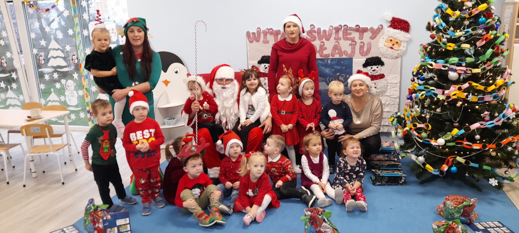 Grudzień to krótki, ale magiczny czas wypełniony magią zbliżających się świąt. W tym wyjątkowym czasie wszystkie przedszkolaki odwiedził fantastyczny i długo wyczekiwany gość - Święty Mikołaj. Obdarował nas uśmiechem, ciepłymi życzeniami oraz prezentami. Dzieci zaśpiewały dla niego przygotowaną piosenkę. Kolejne dni upływały nam na świątecznych przygotowaniach szczególnie do jasełek. Uczestniczyliśmy w zajęciach otwartych dla rodziców "Zapachy świąt"- dekorowaliśmy choinkę i pierniczki. Ten wyjątkowy miesiąc zakończyliśmy pięknym występem zatytułowanym "Świeci gwiazdka", preznetując wierszyki, tańce i piosenki.