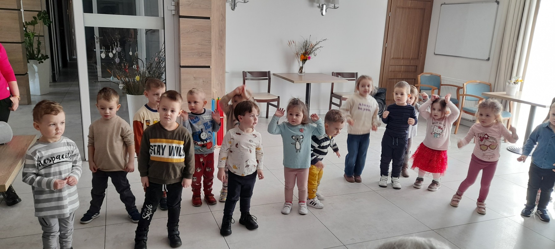 W kwietniu przygotowywaliśmy się do nadejścia Wielkanocy. Z tej okazji wraz z kolegami z grupy "Liski" odwiedziliśmy mieszkańców Villi Parkowej, gdzie zaśpiewaliśmy piosenki i wręczyliśmy wielkanocne kartki. Z radością poszukiwaliśmy nadchodzącej wiosny na spacerach i w ogrodzie przedszkolnym. Obchodziliśmy Dzień Sztuki, wykonując grupowe dzieło malowane pędzlem trzymanym w stópkach i rękach. W kwietniu odbyła się nasza pierwsza wycieczka. Wybraliśmy się na warsztaty wielkanocne do Żartowni, gdzie wykonaliśmy wielkanocną kurę i wybraliśmy się na wycieczkę do lasu. Czas spędzony w tym miejscu był doskonałą zabawą i przyniósł nam wiele radości.