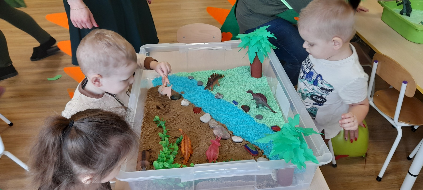 Mroźny luty nie może być nudny, u nas jest zawsze kolorowy. W tym miesiącu obchodziliśmy Tłusty Czwartek, matematyczne zabawy z kolorowymi pączkami przyniosła nam wiele radości. W tym miesiącu mogliśmy poczuć się jak małe kociaki i w Dzień Kota popróbować kocich zabaw i aktywności. Bardzo kolorowym dniem był Dzień Dinozaura, podczas którego wysłuchaliśmy opowiadania o dinozaurach. Tańczyliśmy i pląsaliśmy w rytm piosenek o dinozaurach. Świetnie bawiliśmy się w przygotowanych pudełkach sensorycznych, gdzie z zaciekawieniem znajdowaliśmy dinozaury. Wykonaliśmy wspólnie doświadczenie wybuch wulkanu, które na długo zostało w naszej pamięci.
