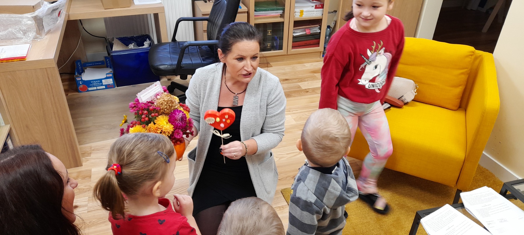 Październik to czas wspaniałych wrażeń w jednej z najbarwniejszych pór roku. Dzieci codziennie aktywnie spędzały czas na świeżym powietrzu. Wśród najczęściej poruszanych obszarów jesiennych tematów znalazły się dary jesieni. Poszukiwaliśmy ich podczas spacerów, wykorzystywaliśmy do prac plastycznych oraz wykonaliśmy sałatkę owocową. Poznaliśmy wielozmysłowo skarby jesieni. W Dzień Edukacji Narodowej złożyliśmy życzenia wszystkim pracownikom przedszkola. Miesiąc zakończyliśmy wyjątkowym Dniem Dyni, gdzie wiele radości przyniosła nam zabawa sensoplastyczna.