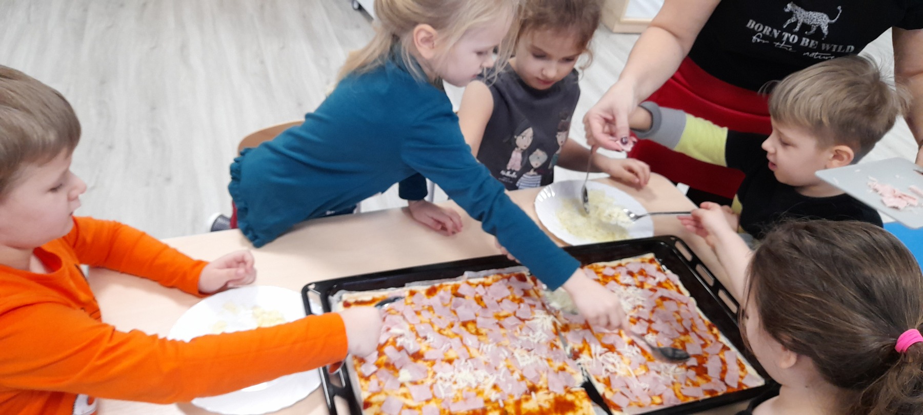 Luty była dla nas bardzo aktywnym miesiącem. Rozpoczęliśmy go od tematyki związanej z dokarmianiem ptaków. Wykonaliśmy własny karmnik oraz kule tłuszczowe z ziarna i smalcu. Z wielkim zaciekawieniem i radością obserwowaliśmy jak każdego dnia pojawia się coraz to więcej ptaków w przygotowanej przez nas ptasiej stołówce. Ponieważ bardzo lubimy ćwiczenia sensoryczne stworzyliśmy prawdziwe dzieła z błota oraz folii bąbelkowej realizując dwa zadania z projektu edukacyjnego „Z darami natury świat nie jest ponury”. Sensorycznymi doznaniami smakowymi i zapachowymi mogliśmy cieszyć się również podczas Dnia Pizzy, podczas którego utrwalaliśmy składniki na zajęciach z języka angielskiego oraz wykonaliśmy przepyszną pizzę. W lutym swoje święto obchodzą zakochani. Jednakże my postanowiliśmy spędzić je nieco inaczej, przypominając sobie zasady bezpieczeństwa i higieny oraz istotnych zasad ważnych dla naszego zdrowia. Wspólnie wykonaliśmy plakat pod hasłem „Bezpieczne Walentynki 2022” wykonując zadania PSSE w Koninie. Swoje święto obchodzą również radiowcy, dlatego postanowiliśmy wysłać kartkę do zaprzyjaźnionego radiowca z Melo Radia w Koninie. Doskonale bawiliśmy się także wcielając się w jego rolę poprzez przeprowadzanie wywiadów z koleżankami i kolegami. Podstawową potrzebą przedszkolaków jest zabawa, dlatego Dzień Dinozaura i Bal Karnawałowy od samego początku do końca dnia wypełnione byli fantazyjnymi zabawami w gronie przedszkolnych przyjaciół.