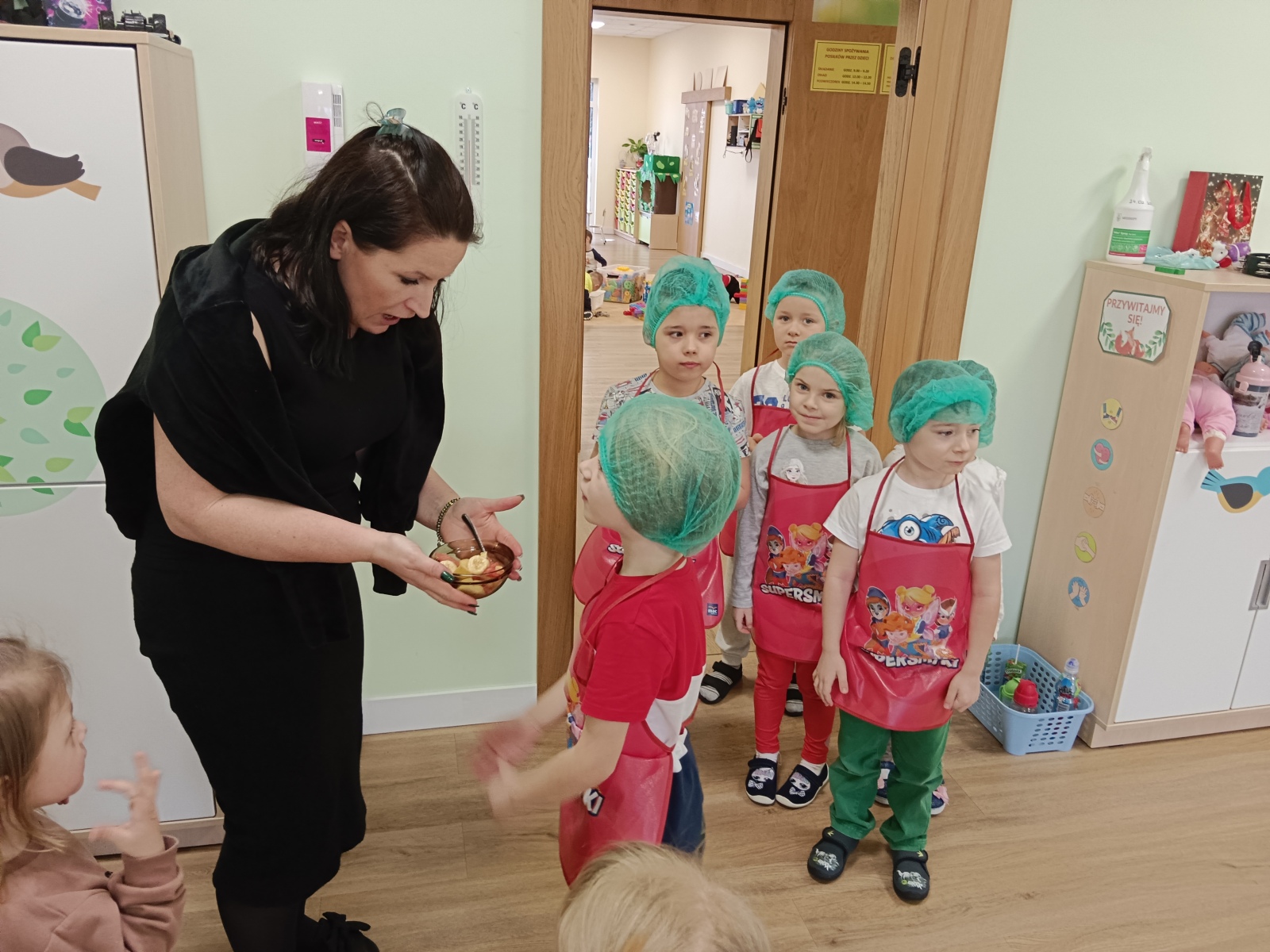 Dzieci chętnie uczęszczają do przedszkola, są pogodne, otwarte, ciekawe i aktywne zarówno podczas zabaw jak i zajęć. Dzieci bardzo lubią różnego rodzaju gry i zabawy ruchowe z muzyką, chustą animacyjną czy SIgumą, które organizowane są w sali przedszkolnej jak i na świeżym powietrzu. Dzieci z naszej grupy są pełne energii, ciekawe świata, dlatego też działania w naszej grupie są bardzo urozmaicone, kładące nacisk na wspieranie całościowego rozwoju dziecka. Przedszkolaki aktywnie uczestniczą i angażują się we wszystkie proponowane działania. Wspólnie chętnie zdobywają wiedzę na temat zasad zgodnego współżycia w grupie. Starają się być samodzielne, pomagają sobie. Z chęcią uczą się nowych wierszyków, piosenek i rymowanek, lubią tańczyć. Każdy dzień wypełniony jest radosną zabawą, zajęciami edukacyjnymi, zajęciami dodatkowymi oraz spacerami, dzięki czemu uśmiech nie znika z dziecięcych twarzy. Edukacja łączy się z zabawą, przez co dzieci zdobywają nowe wiadomości i umiejętności.