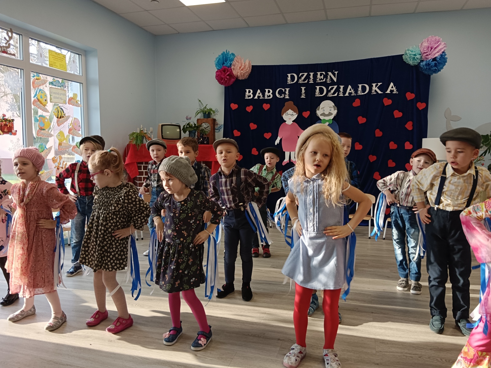 Z okazji Dnia Babci i Dziadka w styczniu gościliśmy w przedszkolu ukochanych dziadków. Dzieci przedstawiły część artystyczną pt. ,,Historia babci i dziadka”. Przedszkolakom udało się przenieść gości w czasy ich młodości, kiedy to ,,w kolejkach do sklepu poznali się babcia i dziadek”. Podróż do lat osiemdziesiątych wywołała radość na twarzach naszych ukochanych gości. Przedszkolaki wręczyły ukochanym dziadkom upominki, po czym celebrowaliśmy wspólnie ich święto przy stole. Było to bardzo radosne i wzruszające spotkanie zarówno dla gości jak i ich wnuków.