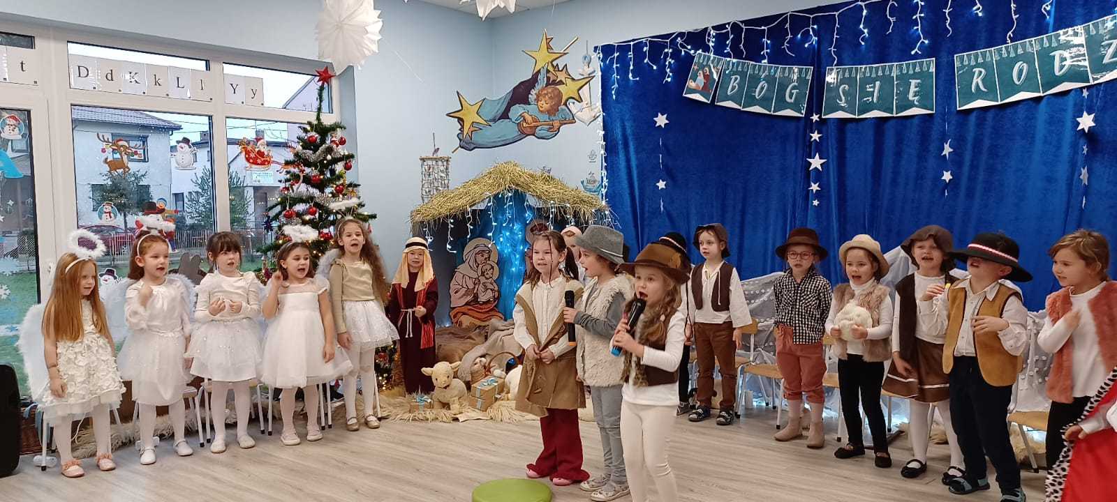 Miesiąc grudzień przyniósł nam już na samym początku niezwykłego gościa - odwiedził nas Mikołaj. Dzieci z grupy „Sharks” były bardzo szczęśliwe mogąc go zobaczyć, porozmawiać z nim, przybić piątkę, a w końcu otrzymać wyczekiwaną niespodziankę. Kochany Mikołaju, dziękujemy, że o nas pamiętałeś! 10 grudnia nasza grupa wystąpiła na Jarmarku Bożonarodzeniowym w Rychwale. Dzieci zaprezentowały na scenie taniec „Jingle Bell Rock”, kolędę „Przybieżeli do Betlejem” oraz utwór muzyczny „Pachnie świętami”. Oczekiwanie na święta umiliły nam też spotkania z rodzicami. Pierwsze podczas zajęć otwartych „Pachnie piernikami” oraz drugie z mamą Ani – Panią Izabelą Przetacznik podczas których dzieci własnoręcznie stworzyły czapki skrzata ze sznurka. Ten czas wypełniliśmy również śpiewem i tańcem podczas naszych Jasełek, które bez wątpienia na długi czas pozostaną w pamięci naszych bliskich.