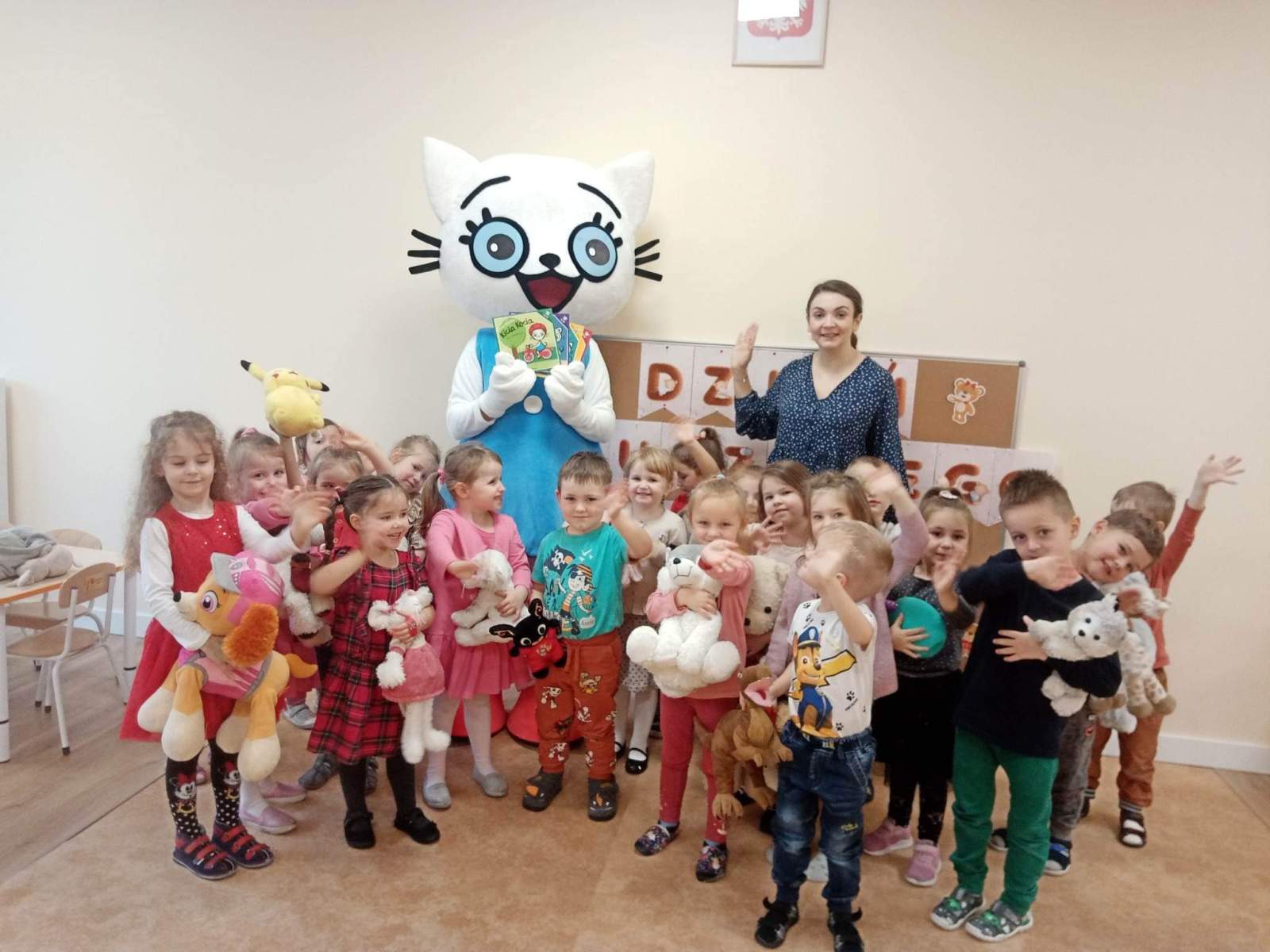 W listopadzie dzieci z grupy „Żyrafki” celebrowały Dzień Postaci z Bajek. Ciocie przygotowały dla nas niezwykłą niespodziankę w postaci biletowanego wyjścia na teatrzyk pod tytułem „Czerwony Kapturek” oraz przyjęcia, na którym świetnie bawiliśmy się w naszych pięknych strojach. W tym dniu odwiedził nas także wspaniały bajkowy gość a mianowicie Kubuś Puchatek z dzbankiem pełnym cukierków! Każdy z nas tego dnia mógł się poczuć wyjątkowo i bawić się radośnie z innymi. W tym miesiącu wzięliśmy udział w akcji MEN „Szkoła do hymnu”. Ubraliśmy się na galowo i uroczyście odśpiewaliśmy „Mazurka Dąbrowskiego”, aby upamiętnić 104. rocznicę odzyskania niepodległości przez nasz kraj. Jak na małych patriotów przystało wykonaliśmy również utwór „Polska to nasz kraj”. 17 listopada odbyła się wycieczka do teatru im. M. Bogusławskiego w Kaliszu na spektakl zatytułowany „Tadek Niejadek”. Dla wielu przedszkolaków było to pierwsze spotkanie z teatrem, które wprowadziło ich w świat scenicznej kultury. Kilka dni później tuż przed rozpoczęciem Mistrzostw Świata w Piłce Nożnej w Katarze dzieci z grupy „Żyrafki” włączyły się do akcji „Bliżejprzedszkolna strefa kibica”. Wraz z pozostałymi grupami przedszkolaków ubrały się w biało-czerwone barwy i gorąco zagrzewały naszych rodaków do świetnej gry fair play! W kolejnych tygodniach obchodziliśmy Mickey Mouse Day oraz Światowy Dzień Pluszowego Misia.