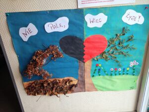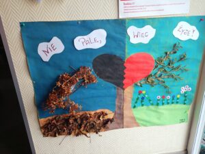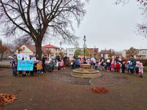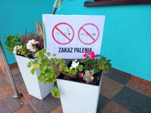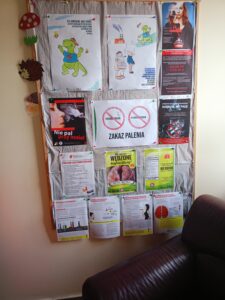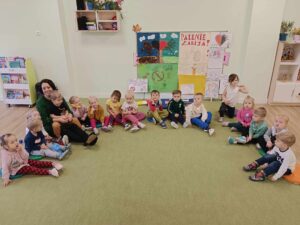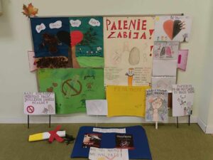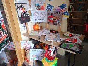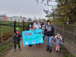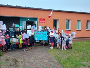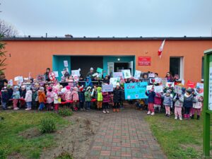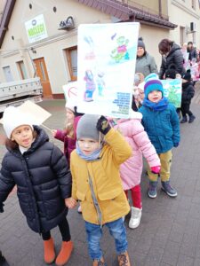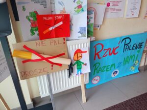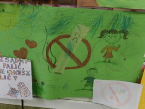 Dzieci zaśpiewały przez przedszkolem piosenkę o Dinku. Trzymając w rączkach transparenty wyruszyliśmy wspólnie na przemarsz ulicami Rychwała. Wykrzykując hasło przewodnie „ Rzuć palenie razem z Nami” zachęcaliśmy mieszkańców Rychwała do porzucenia nałogu. Na rynku skandowaliśmy hasło: „Papieros to wróg nasz – zdrowie zabiera. Nie wolno! To szkodzi! Dość tego polenia! Delfinki pomalowały również całe broszurki na temat czystego powietrza; wybraliśmy się na spacer w celu zaobserwowania co dymi? Cały program uświadomił dzieciom, że nawet przebywanie z dorosłymi, którzy palą jest bardzo szkodliwe i mają prawo powiedzieć : nie pal przy mnie!