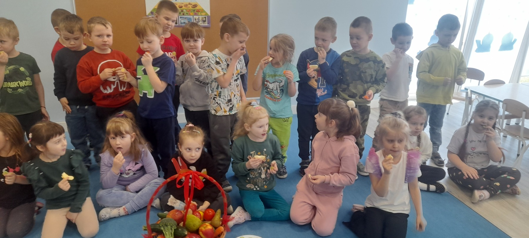 W jego ramach udało się poruszyć niezwykle ważne kwestie dla zdrowia. Pierwszym działaniem było zapoznanie z piramidą zdrowia. Dzięki niemu przedszkolaki dowiedziały się jakich produktów powinno być najwięcej w codziennej diecie, a których najmniej. Samodzielnie układały poszczególne produkty we właściwej kolejności w kształt piramidy. Przeprowadziliśmy degustację przyniesionych warzyw i owoców, których powinniśmy spożywać każdego dnia. Samodzielnie przygotowywaliśmy zdrowe soki przy użyciu wyciskarki, które cieszyły się dużym zainteresowaniem wśród dzieci. Pokazaliśmy, że picie naturalnych soków, bez dodatków cukru i substancji konserwujących to samo zdrowie.