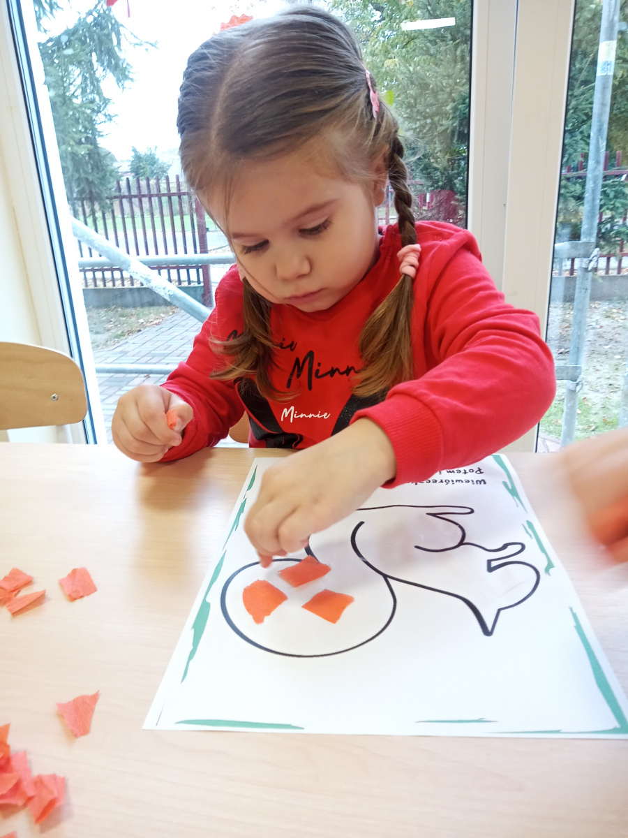 Przedszkolaki chętnie wykonują zadania takie jak np.: karmienie wiewiórki, ozdobienie lisa darami jesieni, policzenie kropek na muchomorku , stworzenie gąsienicy itp.